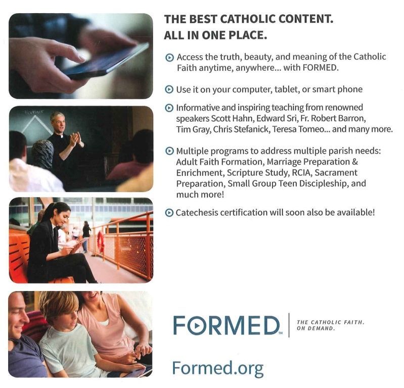 In our busy, technologically evolving world more and more people are using the Internet to work out of their home in having ready access to needed information without scheduling meetings while juggling the needs of busy family life. St. Mary Cathedral has acquired a resource which offers you access to first rate Catholic content available right from home. This tool is called FORMED.